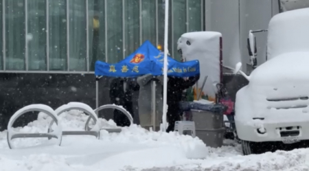 Ngày 22/02, thành phố New York trải qua trận bão tuyết dữ dội mười năm mới gặp, nhiều siêu thị của người Hoa đóng cửa, nhưng các điểm giảng chân tướng của Pháp Luân Công tại Flushing vẫn mở ngoài trời giữa gió tuyết. (Ảnh do Trung tâm Toàn cầu Thoái xuất khỏi ĐCSTQ cung cấp)