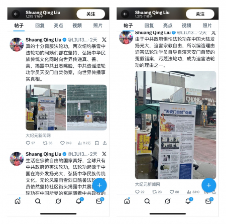 Ông Lưu Song Khánh thấy điểm giảng chân tướng của Pháp Luân Công vẫn mở giữa bão tuyết, ông đã đăng bài trên nền tảng X để bày tỏ sự khâm phục của mình. Ông nói: “Là một người Trung Quốc có lương tri, nhất định phải ủng hộ Pháp Luân Công.” (Ảnh chụp màn hình tài khoản X của ông Lưu Song Khánh)