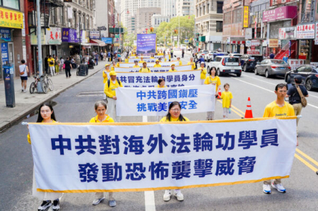 Các học viên Pháp Luân Công diễu hành tại khu phố người Hoa ở Manhattan vào ngày 20/07/2025, lên án các cuộc tấn công và đe dọa của Đảng Cộng sản Trung Quốc ở hải ngoại. (Ảnh: Đới Binh/The Epoch Times)