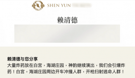 Trung tâm Thông tin Pháp Luân Đại Pháp cho biết từ ngày 28/01 đến ngày 01/02/2026, kẻ xấu (hoặc các thành viên của một băng đảng) đã lợi dụng một trang (web page) trên trang web thuộc Đoàn Nghệ thuật Shen Yun để gửi hơn 200 thông điệp đe dọa bạo lực tương tự. Ví dụ được nêu ở trên chỉ là một trong số đó.