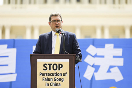 Ngày 18/07/2019 tại bãi cỏ phía Tây của Đồi Capitol ở Washington D.C., nhà hoạt động nhân quyền người Anh Benedict Rogers phát biểu tại cuộc mít-tinh kỷ niệm 20 năm Pháp Luân Công phản đối cuộc bức hại. (Ảnh: Samira Bouaou/The Epoch Times)