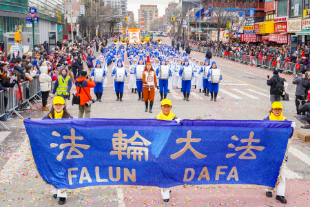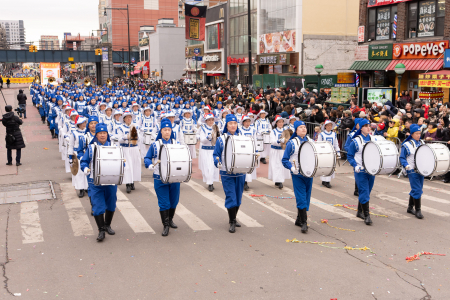 Ngày 21/02, mùng 5 Tết Bính Ngọ, các học viên Pháp Luân Công đã tham gia cuộc đại diễu hành tại Flushing, New York. Trong hình là Đoàn nhạc Thiên Quốc đang đi đầu. (Ảnh: Đới Binh/The Epoch Times)