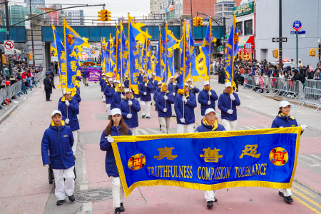 Ngày 21/02/2026, tức mùng 5 Tết Bính Ngọ, các học viên Pháp Luân Công đã tham gia cuộc diễu hành mừng Tết Nguyên đán của cộng đồng người Hoa tại Flushing, New York, mang đến những điều tốt đẹp và chúc phúc. (Ảnh: Trương Tịnh Di/The Epoch Times)