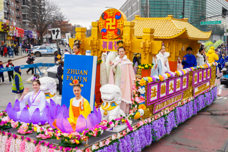 Ngày 21/02/2026, tức mùng 5 Tết Bính Ngọ, các học viên Pháp Luân Công đã tham gia cuộc diễu hành mừng Tết Nguyên Đán của cộng đồng người Hoa tại Flushing, New York, mang đến những điều tốt đẹp và chúc phúc. Trong hình là xe hoa “Thiên Cung Tiên Cảnh”. (Ảnh: Trương Tịnh Di/The Epoch Times)
