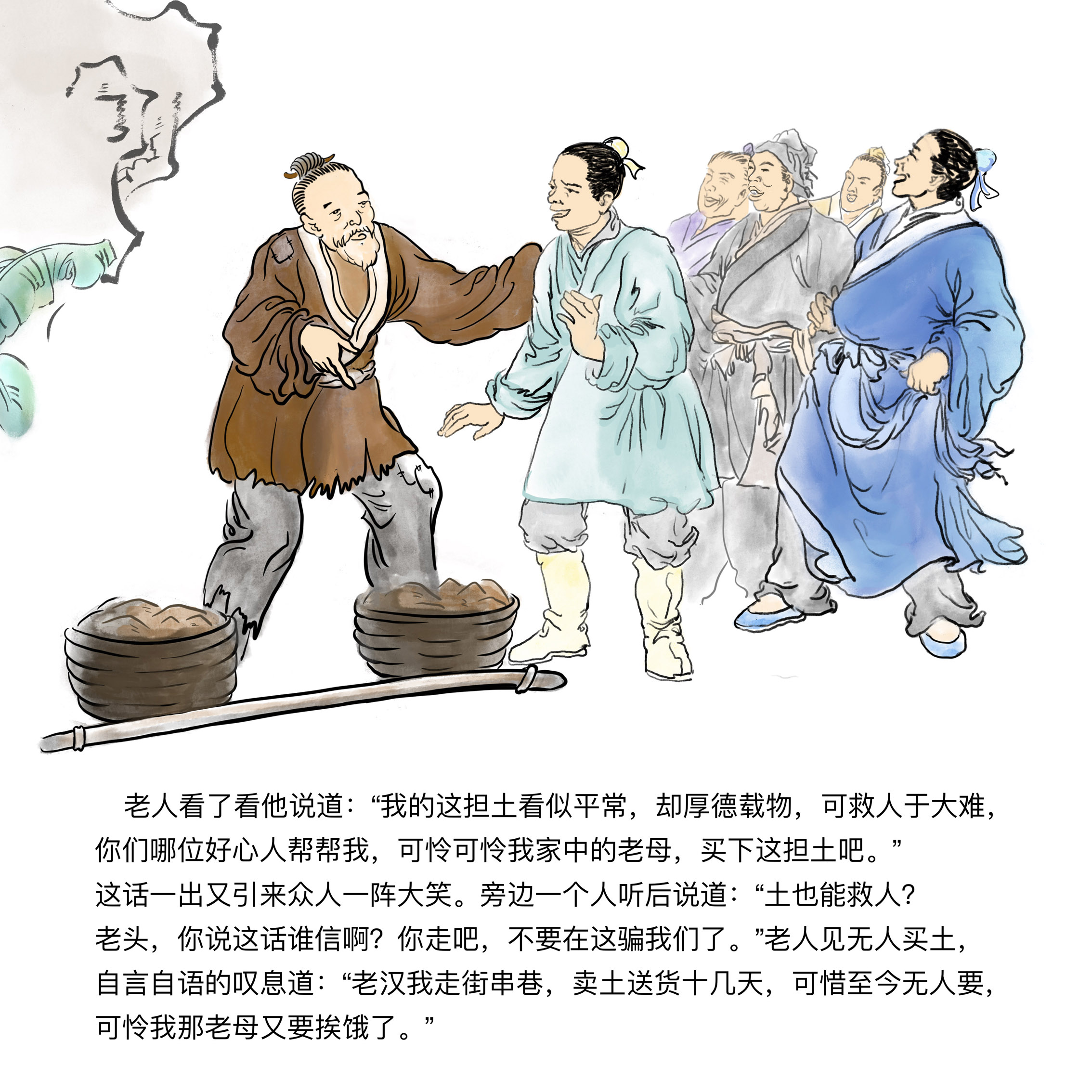 Ông lão nhìn anh ta rồi nói: “Gánh đất của tôi nhìn thì thấy bình thường, nhưng đất này có đức dày có thể nâng đỡ vạn vật, có thể cứu người trong đại nạn. Các vị ai có lòng tốt giúp tôi với, thương xót người mẹ già ở nhà tôi mà mua lấy gánh đất này đi”.