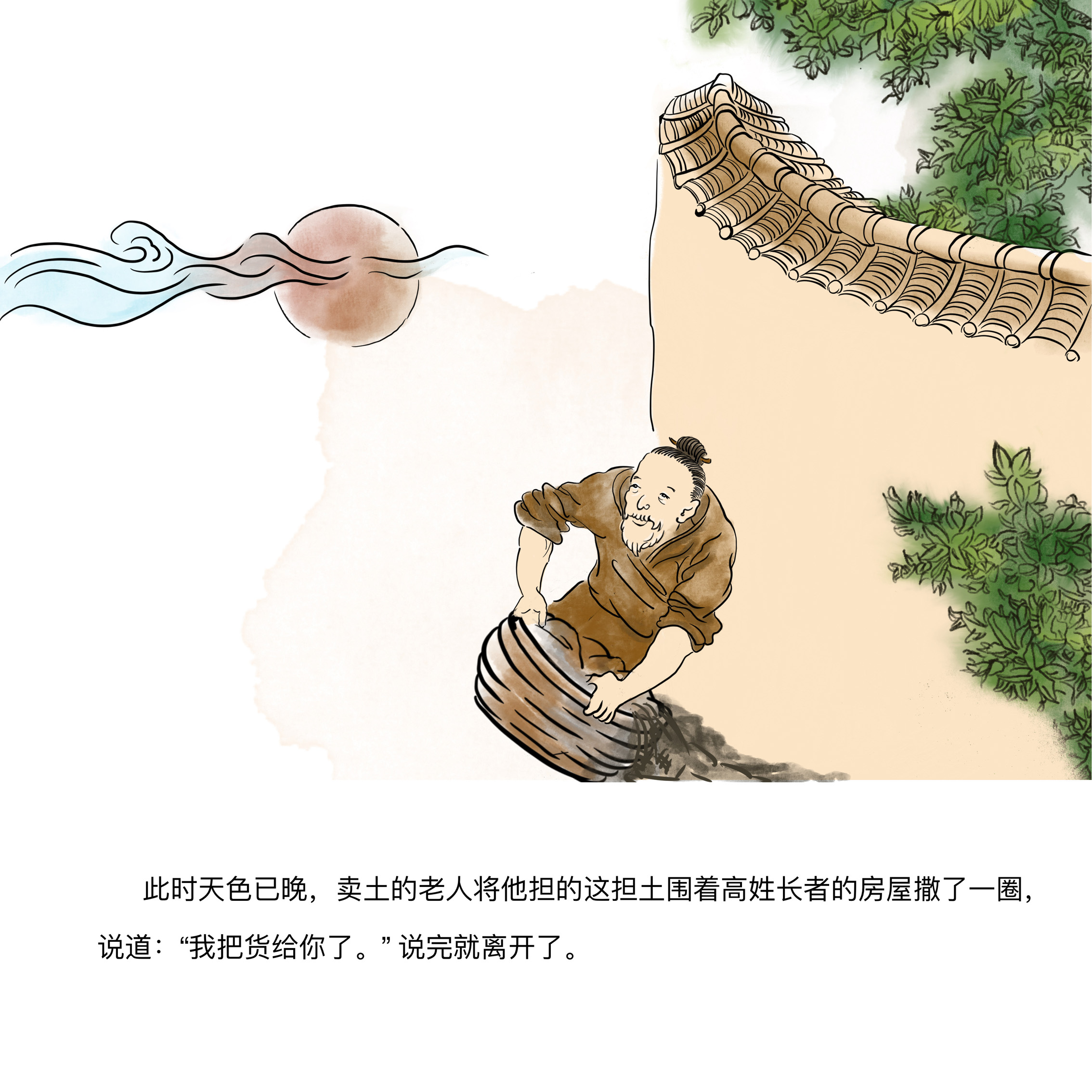 Lúc này trời đã chập tối, ông lão bán đất mang gánh đất đến rải ra xung quanh nhà ông Cao, rồi nói: “Tôi đã giao hàng cho ông rồi”. Nói xong liền đi mất.