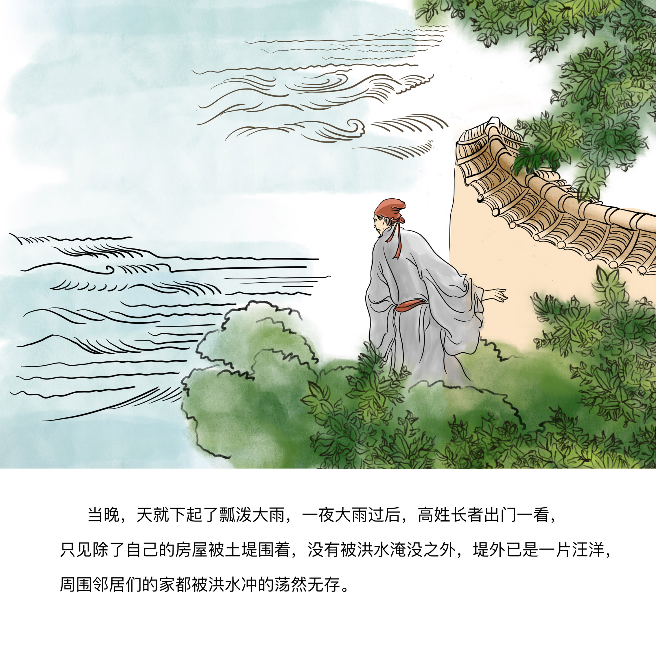 Đêm đó, trời bỗng đổ mưa như trút nước. Sau một đêm mưa lớn, ông lão họ Cao bước ra ngoài nhìn. Chỉ thấy ngoại trừ nhà của ông được một con đê đất bao quanh nên không bị nước lũ nhấn chìm; còn mọi thứ bên ngoài đê thì đã chìm trong biển nước. Nhà cửa của những người hàng xóm đều bị lũ cuốn trôi hết chẳng còn gì nữa.
