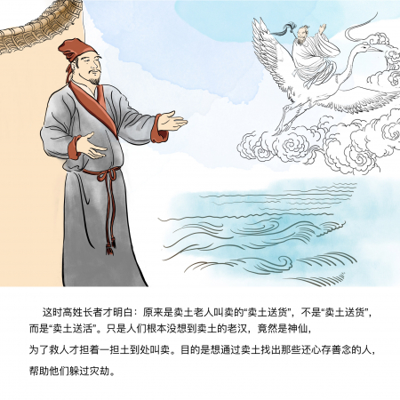 Lúc này, ông lão họ Cao mới minh bạch ra: Lời rao của ông lão bán đất không phải là “bán đất giao hàng” (卖土送货) mà là “bán đất ban phúc” (卖土送福) (một cách chơi chữ trong dân gian) nhưng người đời căn bản không nhận ra điều này, ông lão đó thực ra chính là Thần Tiên.
