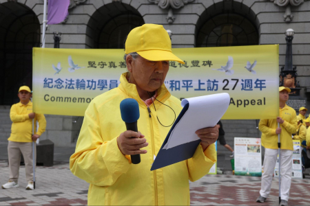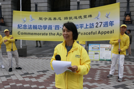 Trong bài phát biểu, bà cho biết: “Tôi cùng các đồng tu đi tàu hỏa đến Bắc Kinh vào tối ngày 24/04. Sáng sớm ngày 25, chúng tôi đến Văn phòng Tiếp dân Quốc gia trên đường Phủ Hữu. Dù hiện trường tuy tập trung rất đông đồng tu đến từ khắp nơi trong cả nước, nhưng tất cả đều trật tự chỉnh tề, không khí tường hòa trang nghiêm, hoàn toàn không có tiếng ồn ào. Người dân Bắc Kinh đi ngang qua phần lớn đều nhìn chúng tôi với ánh mắt tò mò và thân thiện. Chúng tôi lặng lẽ đứng chờ, mãi đến chiều tối khi có tin đã đạt được thỏa thuận, mọi người mới rời đi có trật tự dưới sự hướng dẫn của phụ đạo viên. Khoảnh khắc trước khi rời đi, những cảnh sát nhìn theo bóng lưng chúng tôi yên lặng ra về, trong ánh mắt lộ rõ sự kính trọng.”