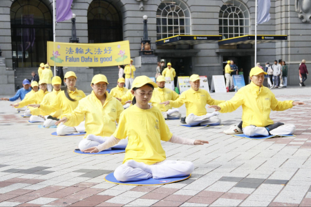 Trước khi buổi mít tinh chính thức bắt đầu, đông đảo học viên Pháp Luân Công từ Auckland và các khu vực lân cận đã cùng nhau luyện công tập thể trên quảng trường. Tiếng nhạc thanh khiết, trầm bổng hòa cùng khung cảnh luyện công thư thái, tường hòa đã thu hút rất đông người dân dừng chân chụp ảnh. Xen kẽ giữa các bài phát biểu, Đoàn nhạc Thiên Quốc đã trình diễn nhiều bản nhạc với khí thế hào hùng, tiết tấu thanh thoát.