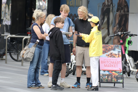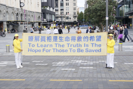 Ngày 18/04/2026, một số học viên Pháp Luân Công tại New Zealand đã tổ chức mít tinh tại Quảng trường Elizabeth, trung tâm thành phố Auckland, kỷ niệm 27 năm cuộc thỉnh nguyện ôn hòa ngày 25/04/1999 của 10.000 học viên. Ảnh chụp các học viên Pháp Luân Công đang giảng chân tướng tại quảng trường. (Ảnh: Trần Chí Huệ/The Epoch Times)