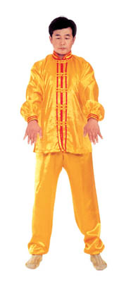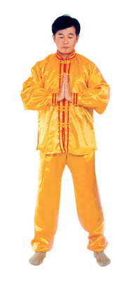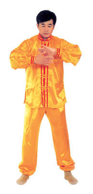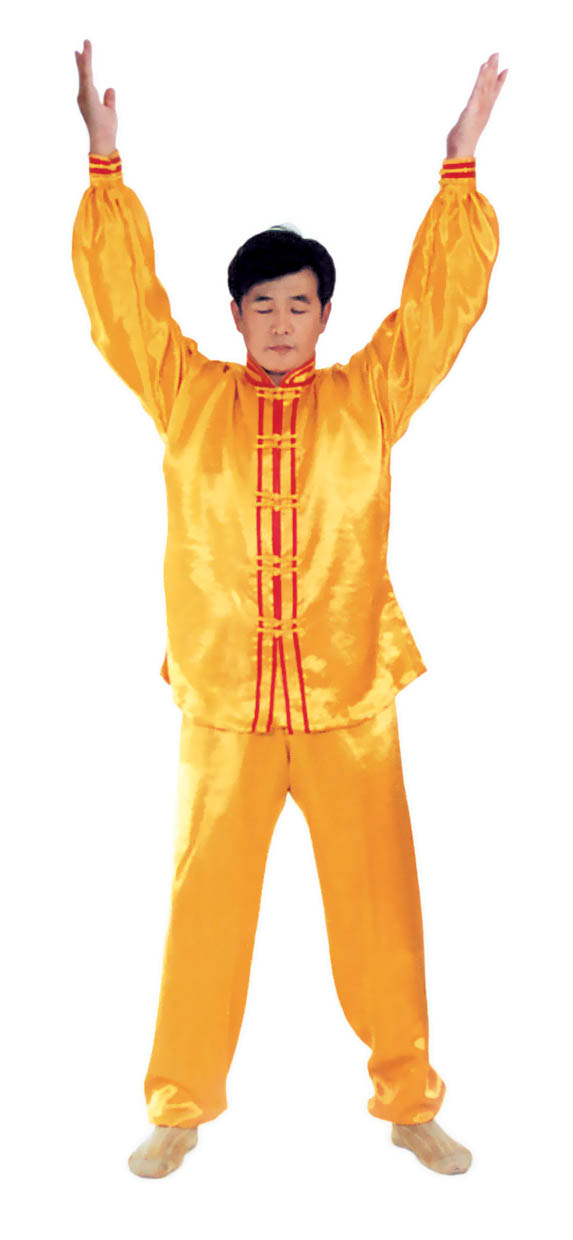 Chưởng chỉ càn khôn[5]: Bắt đầu từ thế “hợp thập”. Hai bàn tay tách ra, cách nhau chừng 2~3cm, đồng thời bắt đầu xoay bàn tay, nam tay trái (nữ tay phải) xoay hướng vào ngực, tay phải hướng ra ngoài ngực, hình thành tay trái ở trên, tay phải ở dưới và cẳng tay giống hình chữ “nhất” (nữ thì trái phải ngược lại), (như hình 1.6) Tiếp theo, cẳng tay trái duỗi thẳng chếch lên bên trái, bàn tay úp xuống, độ cao bàn tay ngang với đầu thì dừng; tay phải đặt chỗ trước ngực, bàn tay ngửa lên. Thuận theo khi tay trái dần dần tới vị trí, thì toàn thân cũng dần dần căng thẳng, đầu dựng lên, chân dẫm xuống. Tay trái duỗi thẳng phía chếch bên trái, tay phải ở trước ngực, bắp tay thẳng hướng phía ngoài (như hình 1.7). Duỗi khoảng 2~3 giây đồng hồ, rồi toàn thân lập tức buông chùng, tay trái lại thu về chỗ trước ngực và cùng với tay phải thành trạng thái “hợp thập”. Sau đó lại xoay bàn tay, triển khai tay phải (nữ tay trái) ở trên, tay trái ở dưới (như hình 1.8). Tay phải lặp lại động tác vừa rồi của tay trái, tức là cẳng tay duỗi chếch sang bên phải, bàn tay úp xuống, bàn tay có độ cao ngang đầu; tay trái vẫn ở chỗ trước ngực, bàn tay ngửa lên. Sau khi duỗi căng xong (như hình 1.9) toàn thân lập tức buông chùng. Thu tay về sau đó hai tay “hợp thập” trước ngực (như hình 1.5)