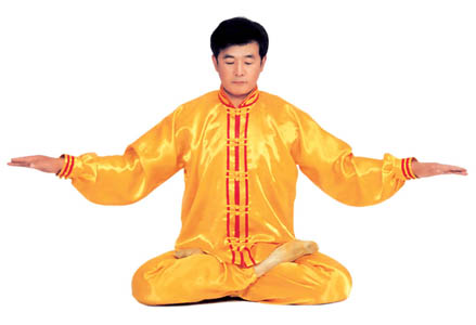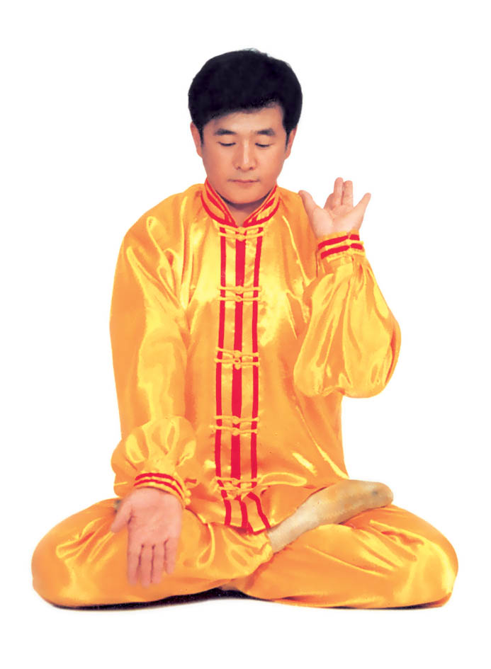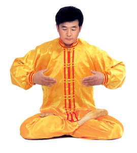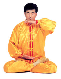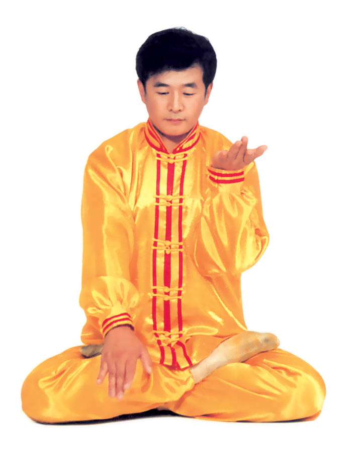 Tu luyện tĩnh công: Tiếp theo tư thế trên, sau đó, tay trên vạch một nửa hình tròn ra phía trước và rơi vào chỗ bụng dưới, hai tay trở thành trạng thái kết ấn (như hình 5.15), tiến nhập vào tu luyện tĩnh công. Nhập định, thời gian càng lâu càng tốt.