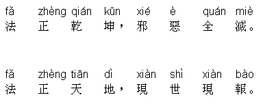Dịch từ bản tiếng Hán: //gb.falundafa.org/chigb/jjyz2_31.htm. Lưu ý, phần sau đây là phần do các học viên soạn, không nằm trong chính văn. Người dịch soạn theo bản tiếng Anh và thêm phần phiên âm Hán Việt. Tham khảo: //en.minghui.org/emh/special_column/righteous_thoughts.html.