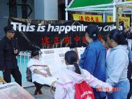 Có một lần chúng tôi ăn tối tại một nhà hàng Hoa kiều. Trước khi kêu món ăn, chúng tôi hỏi người chạy bàn nếu cô ta nghe về Pháp Luân Công và cô ta có xem triển lãm của chúng tôi chưa. Người chạy bàn hình như là dân Trung Quốc bất thình lình trở nên khó chịu, và nói “tôi không thích chính trị lắm” và cô ta bước đi rất nhanh. Khi chúng tôi trả tiền ăn, chúng tôi cũng đưa cho cô ta những tài liệu giảng rõ sự thật và một cái dĩa về vụ tự thiêu tại Thiên An Môn. Lần này, người chủ nhà hàng cũng đến. Chúng tôi nhìn thẳng vào họ và nói rất thật tình “Pháp Luân Công không tham gia chính trị. Chúng tôi chỉ tu luyện để tự nâng cao đạo đức thôi. Chúng tôi chỉ thỉnh nguyện để chấm dứt chính sách khủng bố thôi. Chúng tôi là những người có công ăn việc làm đàng hoàng, chúng tôi đến đây vào ngày cuối tuần để nói cho các bạn biết. Xin đọc tài liệu này.” Người phụ bàn trở nên dễ chịu hơn và gật đầu. Người chủ nhà hàng cầm lấy tài liệu và nói “tốt, tốt, chúng tôi sẽ đọc và xem nói” Sau đó cô ta hỏi cô ta có thể dùng máy DVD để xem cái dĩa đó không?