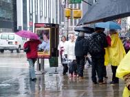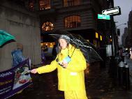 Các đệ tử Pháp Luân Công giảng rõ sự thật tại Manhattan, mặc dầu trời mưa bão