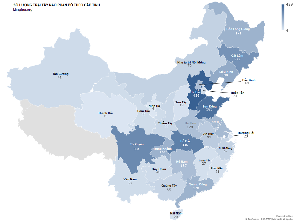 Chỉ với một từ khóa tìm trong các bài trên Minh Huệ Net từ năm 1999 đến 2019 đã thu được khoảng 65.000 bài viết, trong đó cụm từ “trung tâm tẩy não” xuất hiện tổng cộng hơn 210.000 lần. Sau khi loại ra các trung tâm tẩy não không có địa điểm chính xác và tích hợp các trung tâm với tên gọi khác nhau, chúng tôi ước tính rằng có khoảng 3.640 cơ sở như vậy được thiết lập trên khắp Trung Quốc.