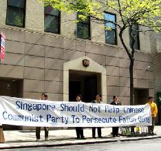 Học viên Pháp Luân Công thỉnh nguyện trước Lãnh sự quán Singapore tại New York và kêu gọi ngay lập tức thả tự do cho 2 học viên vô tội này và kêu gọi chính phủ Singapore ngừng tham gia cuộc bức hại Pháp Luân Công.