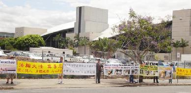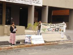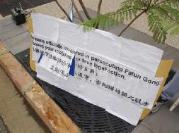 [MINH HUỆ 24-10-2005] Ngày 18 tháng mười 2005, một số học viên Pháp Luân Công tại Queensland Đông Nam tụ họp trước toà nhà mới của Lãnh sứ quán Trung Quốc. Họ đọc lớn bài Tuyên cáo của Hội Pháp Luân Đại Pháp báo trước cho các viên chức của ĐCSTQ phải ngưng khủng bố Pháp Luân Công.