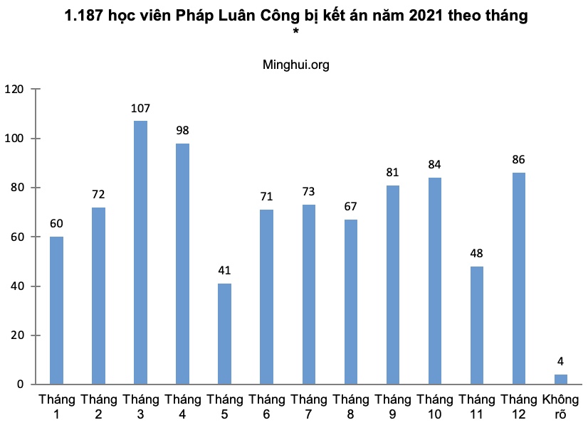 [MINH HUỆ 03-01-2022] Năm 2021 ghi nhận có tổng cộng 1.187 học viên Pháp Luân Công bị kết án tù vì đức tin của họ, một môn tu luyện thân tâm còn được gọi là Pháp Luân Đại Pháp đã bị chính quyền cộng sản Trung Quốc bức hại kể từ năm 1999.