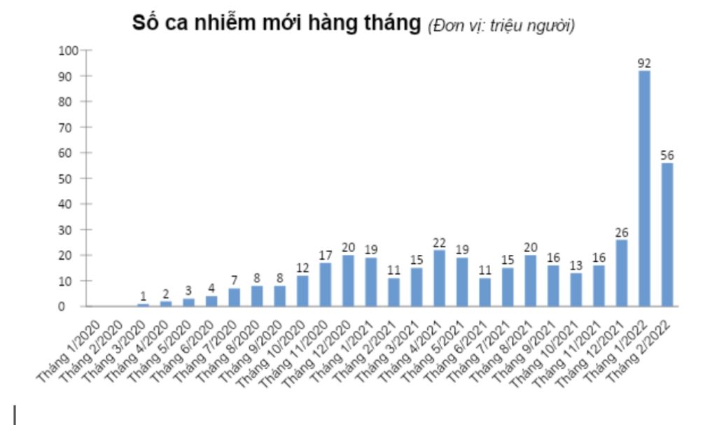 - Sang năm 2022, tháng 1 ghi nhận con số kỷ lục 92 triệu ca nhiễm mới, tháng 2 là 56 triệu ca.