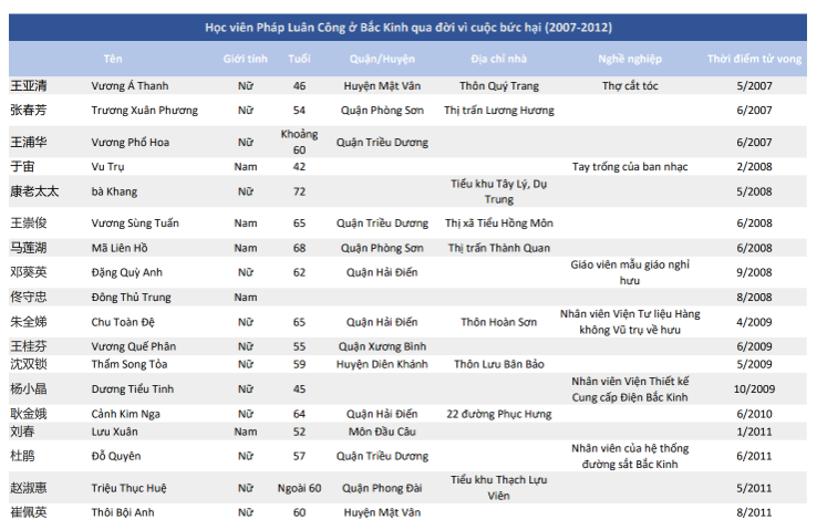 Thống kê chưa đầy đủ của Minh Huệ Net cho thấy, trong 5 năm Vương và Lý lãnh đạo UBCTPL Bắc Kinh, ít nhất 18 học viên Pháp Luân Công (tải danh sách tại đây), đã mất đi mạng sống vì cuộc bức hại và 3.088 học viên khác bị bắt. Sau đây là một số trường hợp.