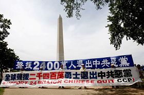 [MINH HUỆ 21-07-2007] Vào ngày 20 tháng 7, 2007, một cuộc tập họp rất lớn để ủng hộ những người đã thoái xuất khỏi Đảng Cộng sản Trung Quốc(ĐCSTQ) được tổ chức tại Washington DC. Hàng ngàn đệ tử Pháp Luân Công từ khắp nơi trên thế giới và các nhà hoạt động nhân quyền tham dự. Hàng chục Hoa kiều từ New York, Boston tuyên thệ thoái xuất khỏi Đảng Cộng sản Trung Quốc trong cuộc tập họp. Ngoài ra, qua hệ thống truyền thanh Đài Tiếng nói Hy vọng, có hơn 20 công dân Trung Quốc thoái xuất khỏi Đảng Cộng sản Trung Quốc trong buổi tập họp. Phó chủ tịch Quốc hội Châu Âu Edward McMillan-Scott, Dân biểu tại Maryland Elijah Cummings và Cựu dân biểu tại Hồng Kông Szeto Wah viết thư ủng hộ cuộc tập họp. Nhiều nhóm người từ Cam bốt, Lào và Việt nam cũng tham gia vào cuộc tập họp.