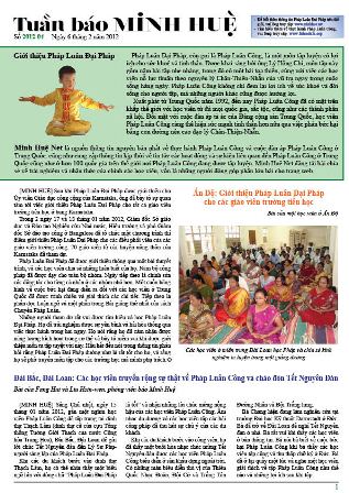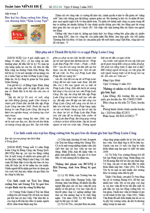 [MINH HUỆ 08-02-2012]Tuần báo Minh Huệ tổng hợp tin tức hàng tuần về cuộc đàn áp ở Trung Quốc và các sự kiện của học viên Pháp Luân Công trên khắp thế giới, với dạng thức là bản in màu định dạng PDF, gồm 4 trang. Bản PDF này định dạng khổ A4 tiện dụng cho việc in ấn phổ thông.