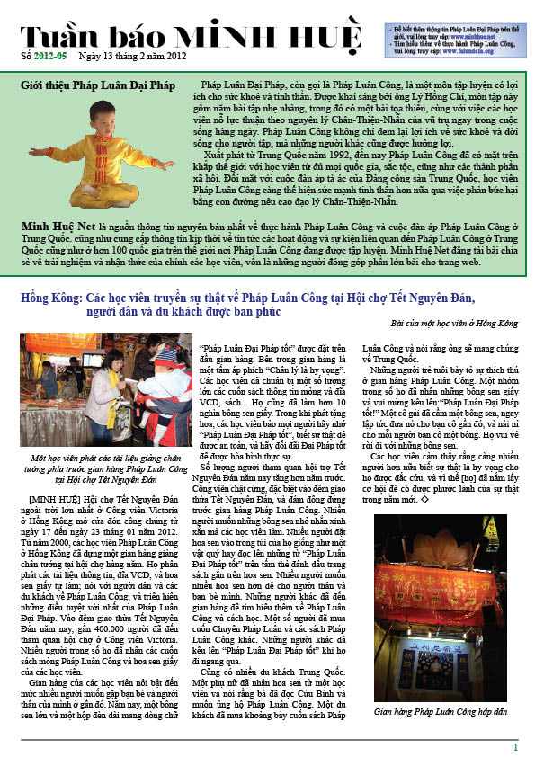 [MINH HUỆ 17-02-2012]Tuần báo Minh Huệ tổng hợp tin tức hàng tuần về cuộc đàn áp ở Trung Quốc và các sự kiện của học viên Pháp Luân Công trên khắp thế giới, với dạng thức là bản in màu định dạng PDF, gồm 4 trang. Bản PDF này định dạng khổ A4 tiện dụng cho việc in ấn phổ thông.