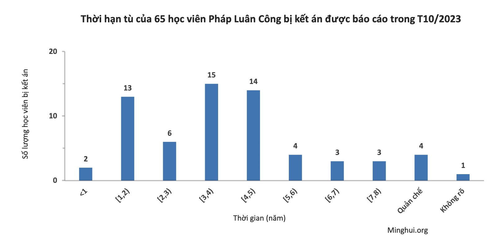 Trong số 65 trường hợp học viên bị kết án mới được báo cáo này, 1 trường hợp xảy ra trong năm 2022, 4 xảy ra vào nửa đầu năm 2023, 2 trong tháng 7 năm 2023, 11 trong tháng 8 năm 2023, 10 trong tháng 9 năm 2023, 10 trong tháng 10 năm 2023, 17 trường hợp trong năm 2023 (không rõ tháng) và 10 trường hợp chưa rõ thời điểm. Bởi sự kiểm duyệt thông tin nghiêm ngặt của chính quyền cộng sản Trung Quốc nhằm che đậy cuộc bức hại để tránh sự giám sát từ quốc tế, các trường hợp bị bức hại vẫn luôn không thể được báo cáo kịp thời hoặc có đầy đủ thông tin.