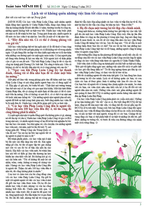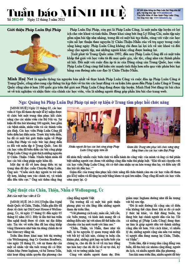 [MINH HUỆ 14-03-2012]Tuần báo Minh Huệ tổng hợp tin tức hàng tuần về cuộc đàn áp ở Trung Quốc và các sự kiện của học viên Pháp Luân Công trên khắp thế giới, với dạng thức là bản in màu định dạng PDF, gồm 4 trang. Bản PDF này định dạng khổ A4 tiện dụng cho việc in ấn phổ thông.