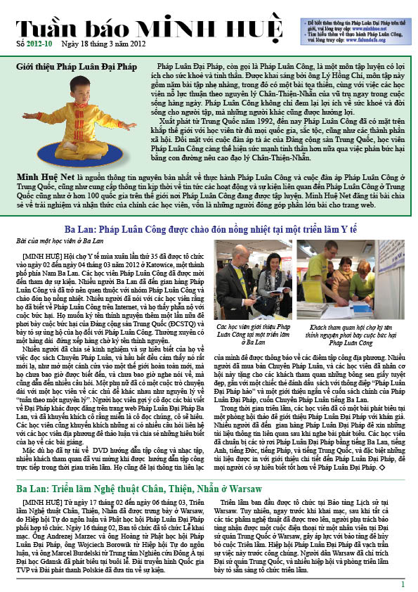 [MINH HUỆ 22-03-2012]Tuần báo Minh Huệ tổng hợp tin tức hàng tuần về cuộc đàn áp ở Trung Quốc và các sự kiện của học viên Pháp Luân Công trên khắp thế giới, với dạng thức là bản in màu định dạng PDF, gồm 4 trang. Bản PDF này định dạng khổ A4 tiện dụng cho việc in ấn phổ thông.