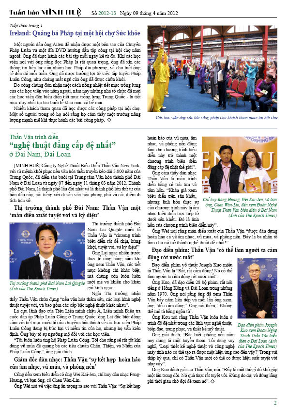 [MINH HUỆ 10-04-2012]Tuần báo Minh Huệ tổng hợp tin tức hàng tuần về cuộc đàn áp ở Trung Quốc và các sự kiện của học viên Pháp Luân Công trên khắp thế giới, với dạng thức là bản in màu định dạng PDF, gồm 4 trang. Bản PDF này định dạng khổ A4 tiện dụng cho việc in ấn phổ thông.
