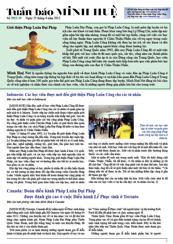[MINH HUỆ 24-04-2012]Tuần báo Minh Huệ tổng hợp tin tức hàng tuần về cuộc đàn áp ở Trung Quốc và các sự kiện của học viên Pháp Luân Công trên khắp thế giới, với dạng thức là bản in màu định dạng PDF, gồm 4 trang. Bản PDF này định dạng khổ A4 tiện dụng cho việc in ấn phổ thông.