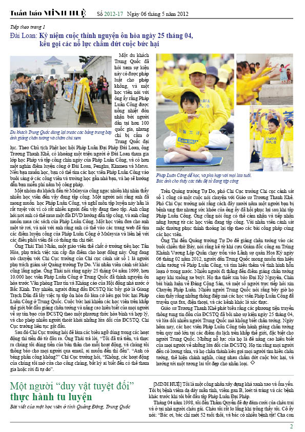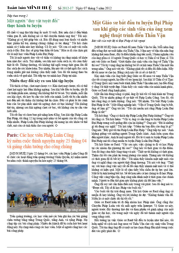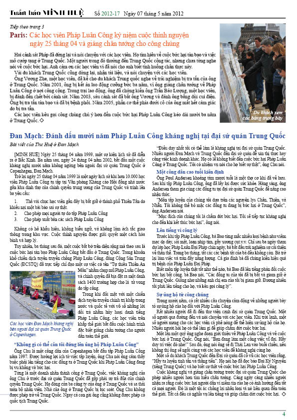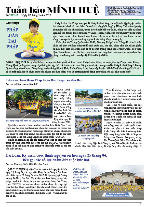 [MINH HUỆ 07-05-2012]Tuần báo Minh Huệ tổng hợp tin tức hàng tuần về cuộc đàn áp ở Trung Quốc và các sự kiện của học viên Pháp Luân Công trên khắp thế giới, với dạng thức là bản in màu định dạng PDF, gồm 4 trang. Bản PDF này định dạng khổ A4 tiện dụng cho việc in ấn phổ thông.
