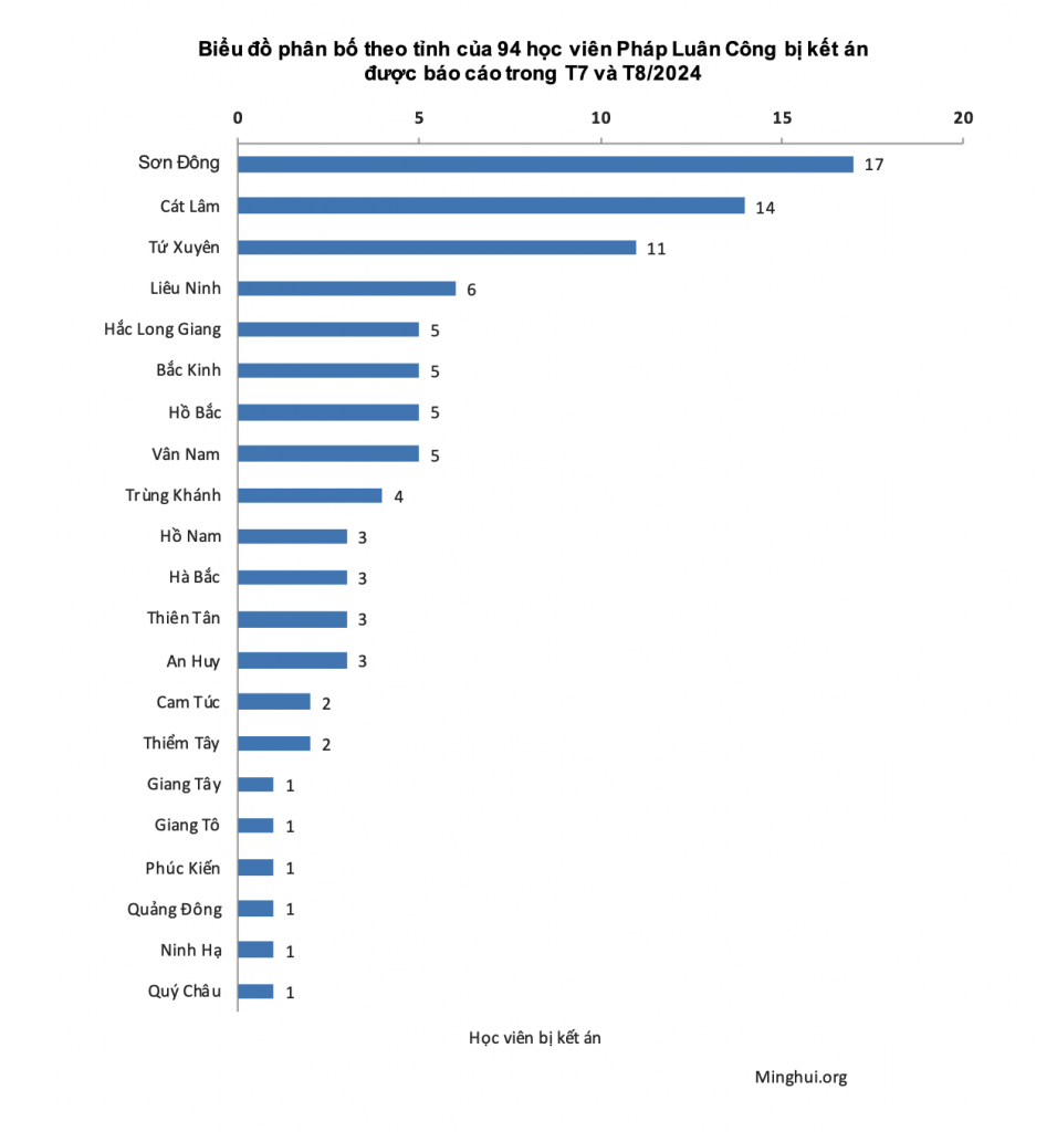 Các học viên bị kết án phân bố ở 18 tỉnh và 3 thành phố trực thuộc trung ương. Sơn Đông, Cát Lâm và Tứ Xuyên đứng đầu danh sách với lần lượt 17, 14 và 11 trường hợp. 18 khu vực còn lại có số trường hợp ở mức 1 chữ số, từ 1 đến 6.