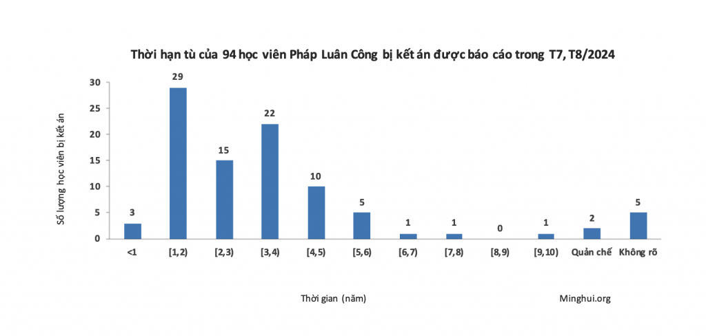 Tháng 7 và tháng 8 năm 2024 ghi nhận tổng cộng 94 trường hợp học viên Pháp Luân Công bị kết án vì kiên định đức tin.