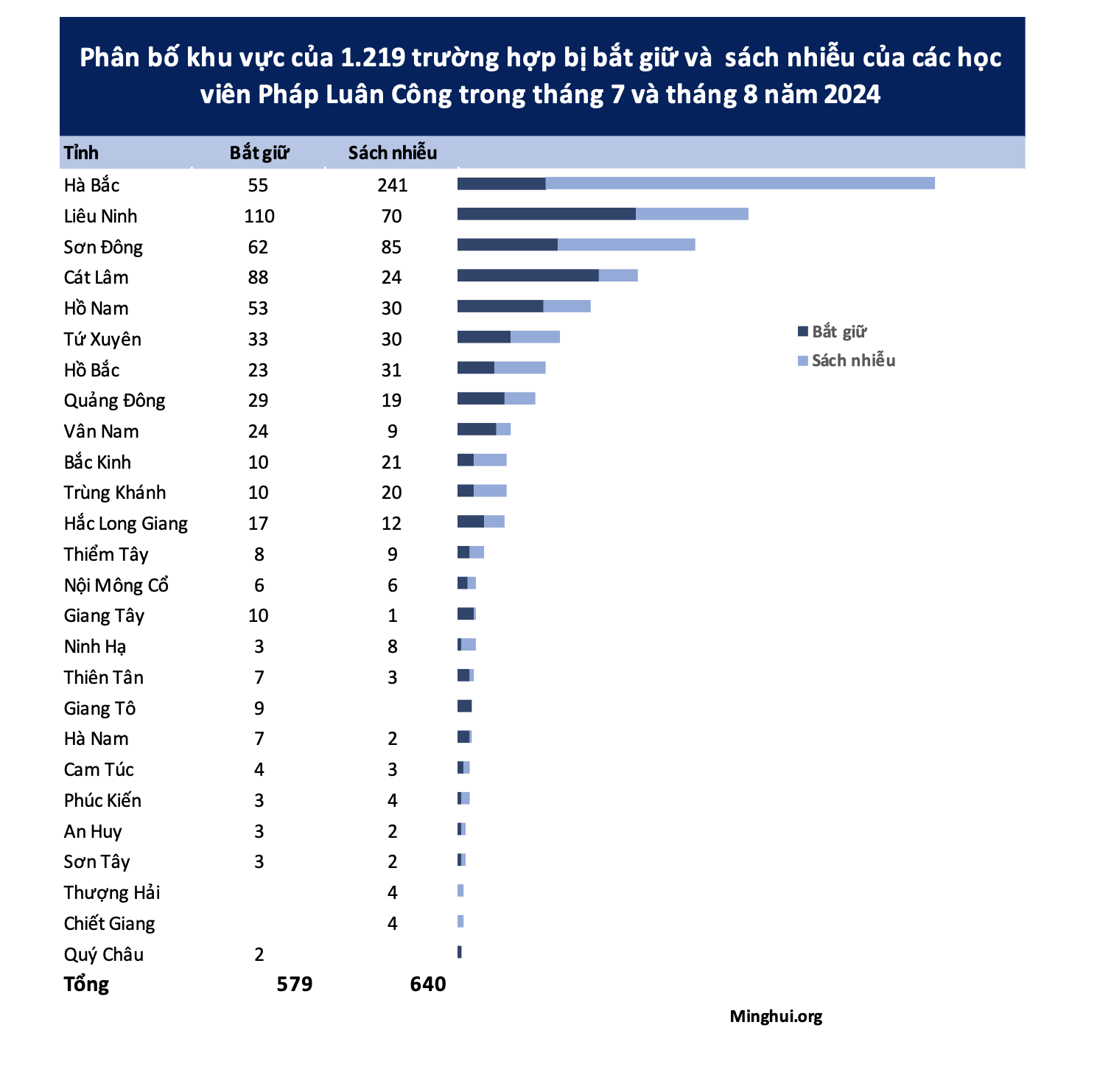 Trong số 1.219 trường hợp, có 579 trường hợp bắt giữ và 640 trường hợp sách nhiễu. 579 trường hợp bắt giữ bao gồm 167 trường hợp xảy ra trong nửa đầu năm 2024, 277 trường hợp tháng 7, 112 trường hợp tháng 8 và 23 trường hợp không rõ tháng. 640 trường hợp sách nhiễu gồm có 242 trường hợp trong nửa đầu năm, 259 trường hợp tháng 7, 112 trường hợp tháng 8 và 27 trường hợp không rõ tháng. Nguyên nhân chủ yếu của việc chậm trễ báo cáo là do sự kiểm duyệt thông tin của chế độ cộng sản Trung Quốc, khiến các phóng viên Minh Huệ khó thu thập, xác minh và gửi dữ liệu đến trang web. Các học viên bị bức hại cũng phải đối mặt với nguy cơ bị trả thù khi báo cáo về việc bức hại bằng tên thật của mình.