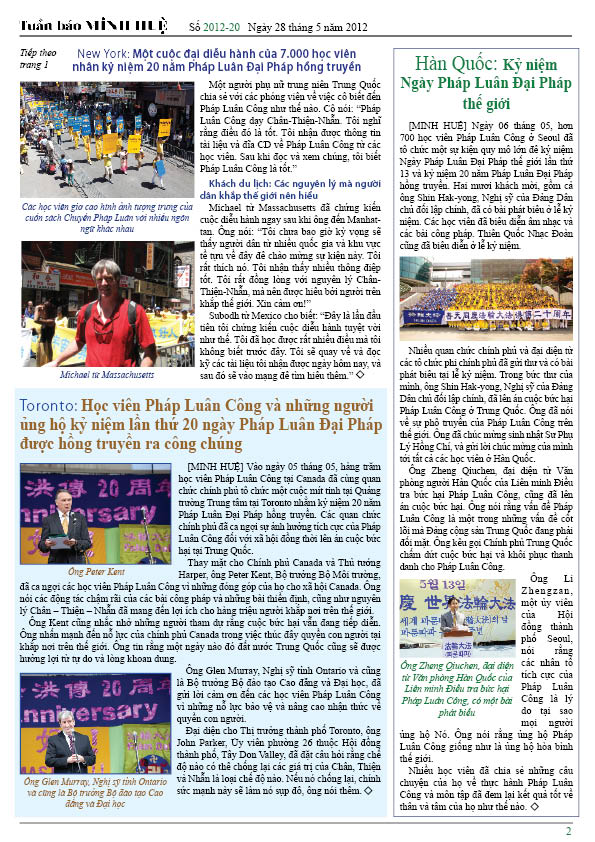 [MINH HUỆ 28-05-2012]Tuần báo Minh Huệ tổng hợp tin tức hàng tuần về cuộc đàn áp ở Trung Quốc và các sự kiện của học viên Pháp Luân Công trên khắp thế giới, với dạng thức là bản in màu định dạng PDF, gồm 4 trang. Bản PDF này định dạng khổ A4 tiện dụng cho việc in ấn phổ thông.