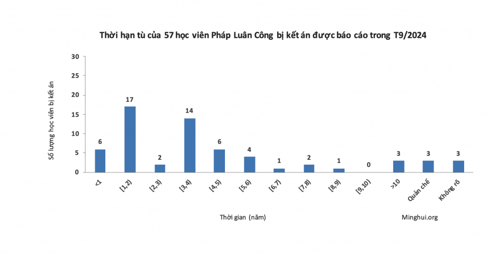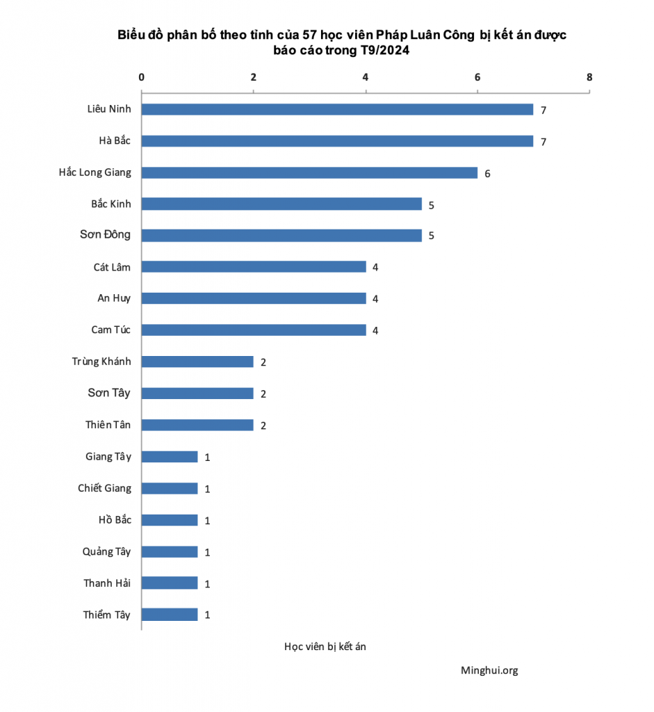 18 trường hợp tử vong mới được báo cáo bao gồm 1 trường hợp xảy ra vào năm 2021, 1 trường hợp năm 2022, 2 trường hợp năm 2023 và 14 trường hợp từ tháng 2 đến tháng 9 năm 2024. 57 trường hợp bị kết án bao gồm 1 trường hợp vào năm 2021, 2 trường hợp năm 2022, 13 trường hợp năm 2023, 30 trường hợp năm 2024 và 11 trường hợp không rõ năm. Do sự kiểm duyệt thông tin nghiêm ngặt, việc bức hại các học viên Pháp Luân Công không phải lúc nào cũng có thể được báo cáo kịp thời, cũng như không phải đều có sẵn tất cả thông tin.