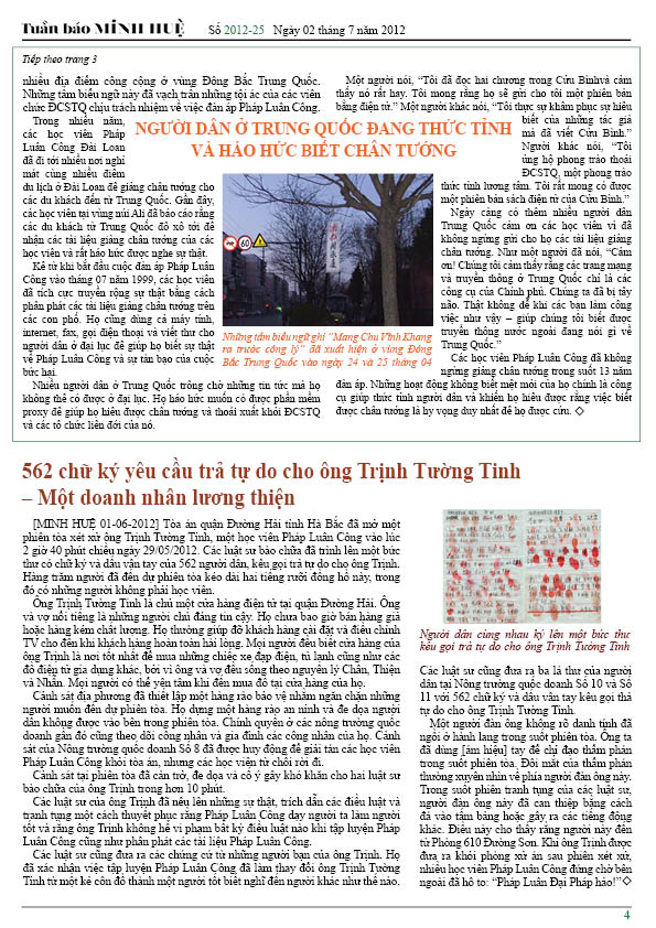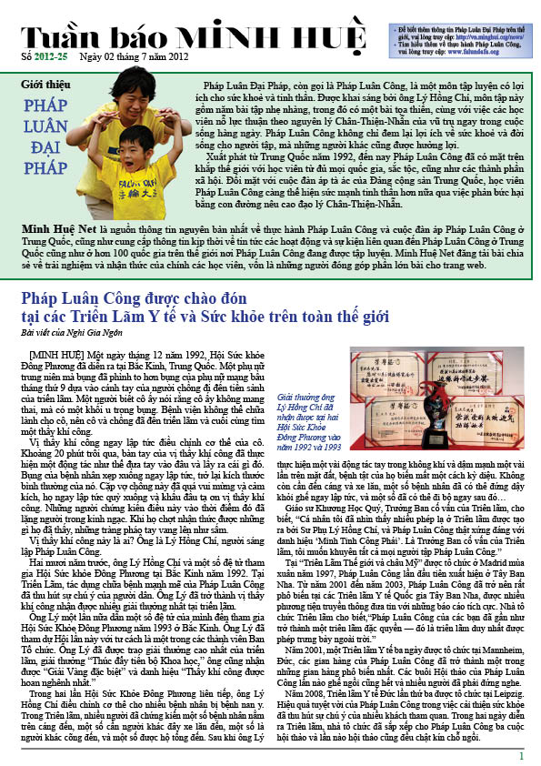 [MINH HUỆ 3-7-2012]Tuần báo Minh Huệ tổng hợp tin tức hàng tuần về cuộc đàn áp ở Trung Quốc và các sự kiện của học viên Pháp Luân Công trên khắp thế giới, với dạng thức là bản in màu định dạng PDF, gồm 4 trang. Bản PDF này định dạng khổ A4 tiện dụng cho việc in ấn phổ thông.