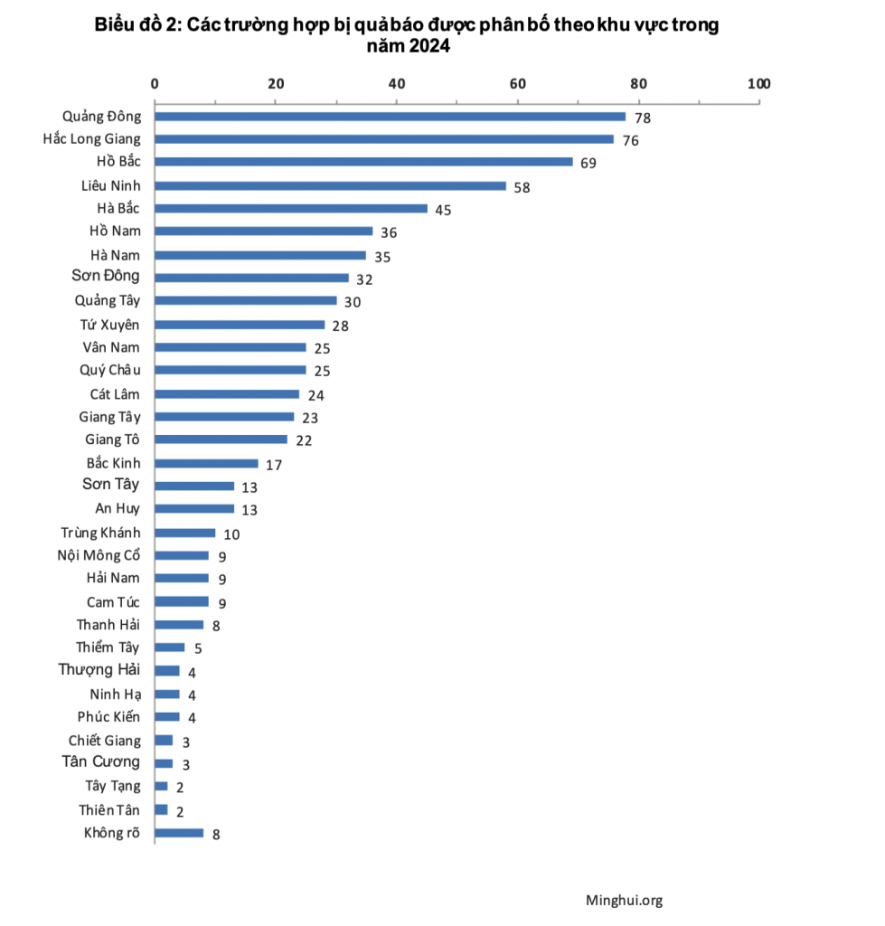729 trường hợp báo ứng diễn ra ở cả 31 tỉnh, thành phố trực thuộc trung ương và khu tự trị. Quảng Đông báo cáo nhiều trường hợp nhất (78), tiếp theo là Hắc Long Giang (76) và Hồ Bắc (69). 16 tỉnh khác cũng ghi nhận các trường hợp 2 chữ số, từ 10 đến 58, trong khi 12 khu vực còn lại có các trường hợp 1 chữ số, từ 2 đến 9. Có 8 trường hợp không rõ tỉnh thành.