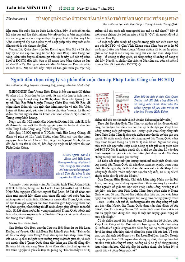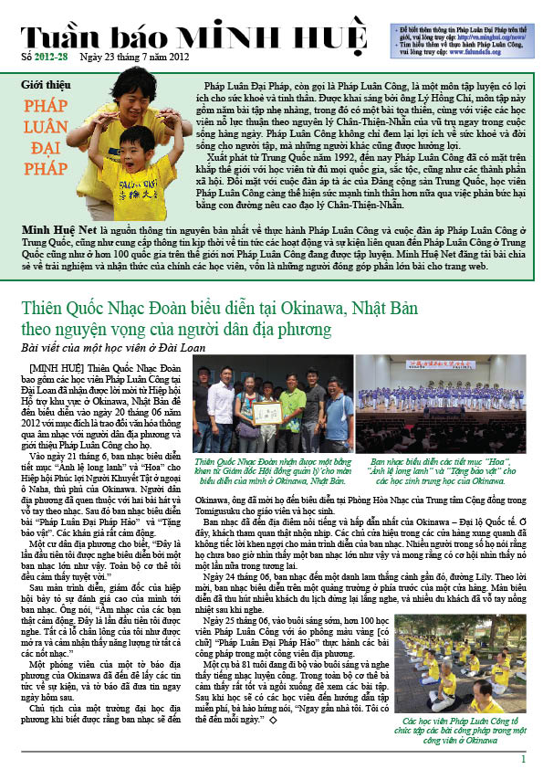 [MINH HUỆ 24-7-2012]Tuần báo Minh Huệ tổng hợp tin tức hàng tuần về cuộc đàn áp ở Trung Quốc và các sự kiện của học viên Pháp Luân Công trên khắp thế giới, với dạng thức là bản in màu định dạng PDF, gồm 4 trang. Bản PDF này định dạng khổ A4 tiện dụng cho việc in ấn phổ thông.