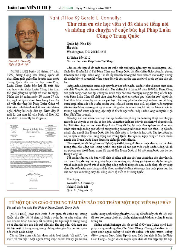 - Nghị sĩ Hoa Kỳ Gerald E. Connolly: Thư cảm ơn các học viên vì đã chia sẻ tiếng nói và những câu chuyện về cuộc bức hại Pháp Luân Công ở Trung Quốc