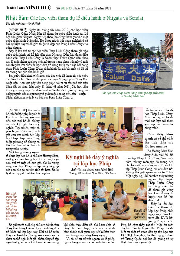 [MINH HUỆ 27-08-2012]Tuần báo Minh Huệ tổng hợp tin tức hàng tuần về cuộc đàn áp ở Trung Quốc và các sự kiện của học viên Pháp Luân Công trên khắp thế giới, với dạng thức là bản in màu định dạng PDF, gồm 4 trang. Bản PDF này định dạng khổ A4 tiện dụng cho việc in ấn phổ thông.