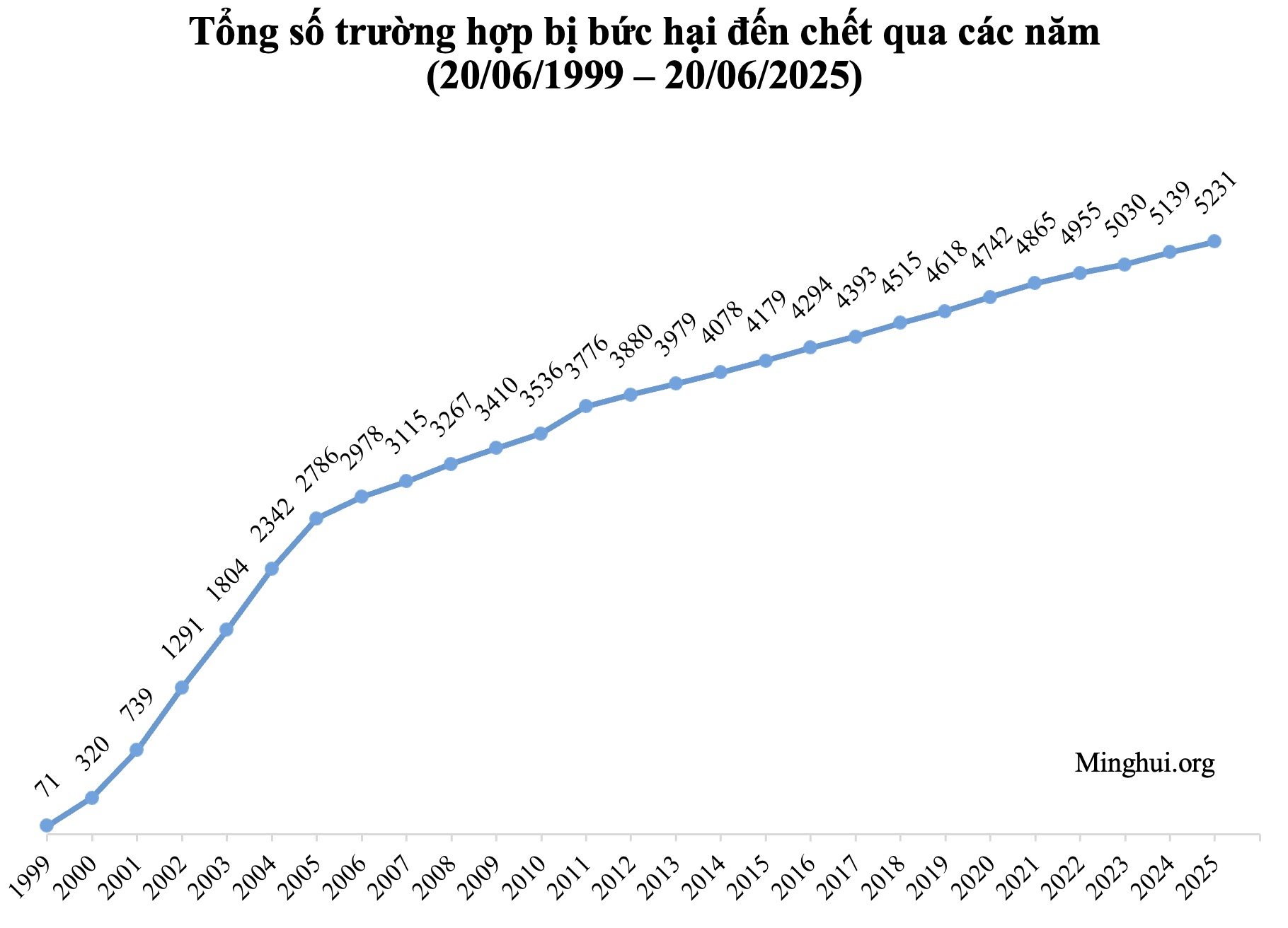 Bài viết này trình bày một bộ biểu đồ thống kê các trường hợp bị bức hại từ khi Minh Huệ Net bắt đầu có dữ liệu từ năm 1999 cho đến ngày 20 tháng 6 năm 2025. Từ nhỏ mà thấy lớn, bộ biểu đồ này vừa phản ánh tình huống cuộc bức hại Pháp Luân Công của Đảng Cộng sản Trung Quốc (ĐCSTQ), vừa phản ánh khả năng đưa tin của các đệ tử Đại Pháp tại địa phương, cũng như thành quả phản bức hại kiên cường “tre già măng mọc” của toàn thể đệ tử Đại Pháp suốt 26 năm qua. Biểu đồ 3, 5, 7, và 9 phản ánh rõ xu thế cuộc bức hại đang đi đến hồi kết.