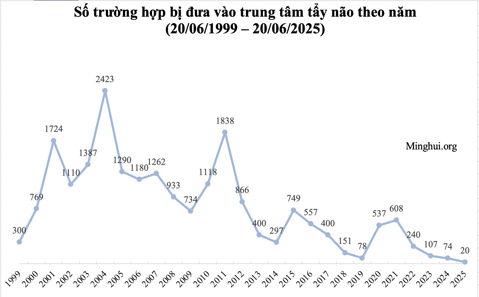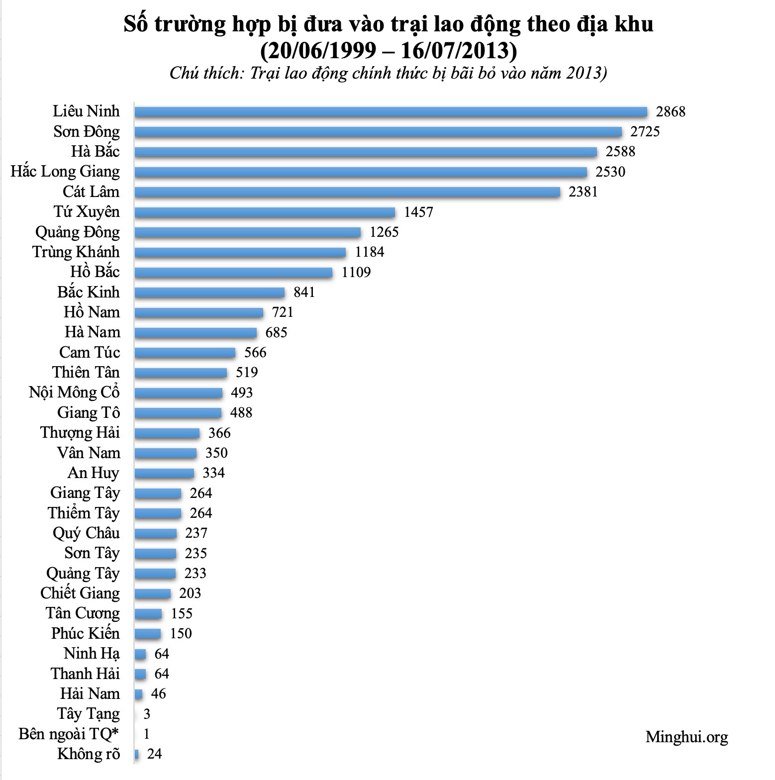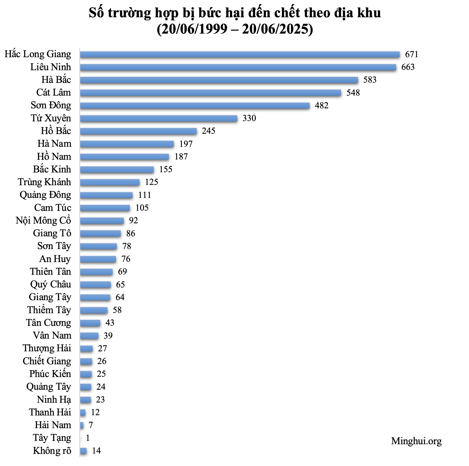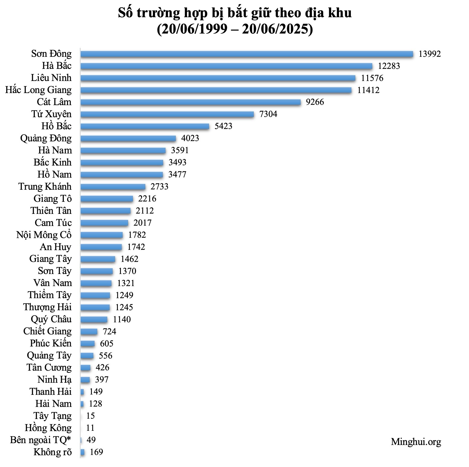 Dữ liệu từ năm 2017 đến 2025 trong các biểu đồ trên đều lấy từ các báo cáo thống kê của Minh Huệ, trong đó dữ liệu từ năm 2017 đến 2023 có sự chênh lệch so với “Báo cáo Minh Huệ: Cuộc bức hại Pháp Luân Công của ĐCSTQ 25 năm qua”. Khả năng đây là lý do khiến số liệu thống kê về tổng số trường hợp phân bố theo năm và phân bố theo địa khu không khớp với nhau.