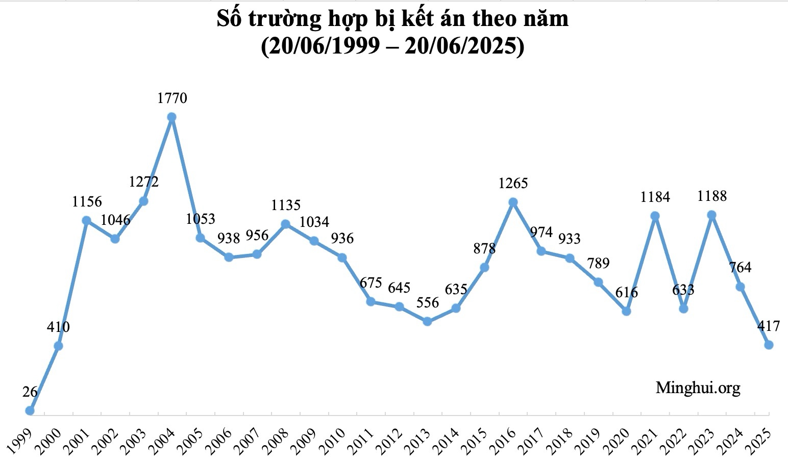 Biểu đồ 3: Số học viên Pháp Luân Công bị kết án phi pháp qua các năm trong 26 năm qua (chưa bao gồm các trường hợp chưa được báo cáo)