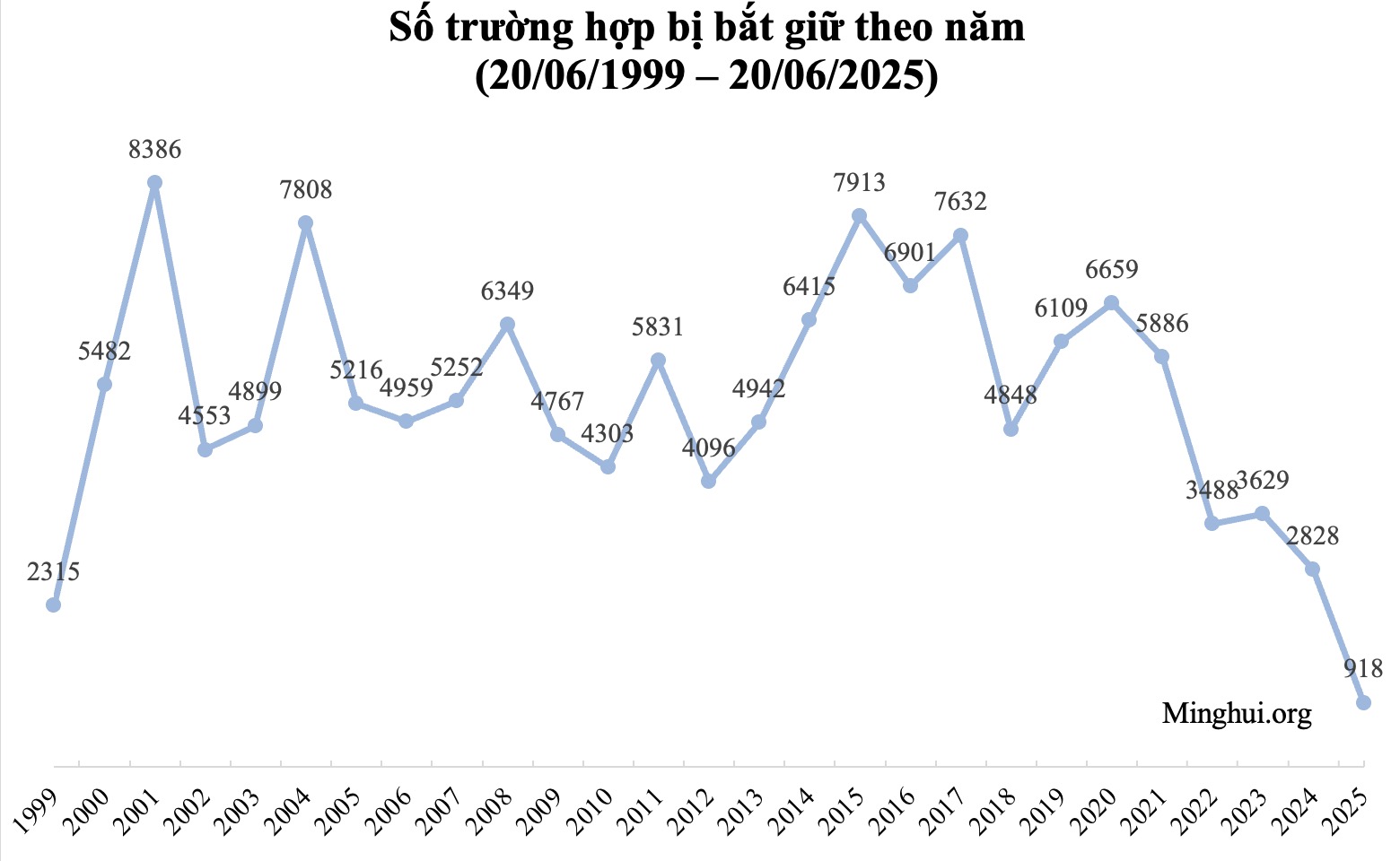 Ghi chú: Tổng số lượt học viên bị bắt cóc có đôi chút chênh lệch giữa số liệu phân bố theo năm và phân bố theo khu vực. Tương tự, dữ liệu từ năm 2016 trở về trước được lấy từ “Báo cáo Minh Huệ: Cuộc bức hại Pháp Luân Công của ĐCSTQ 25 năm qua” (Minghui Report: The CCP’s Persecution of Falun Gong: 25 Years and Counting), các số liệu sau đó được lấy từ các báo cáo thống kê của Minh Huệ (Minghui.org).