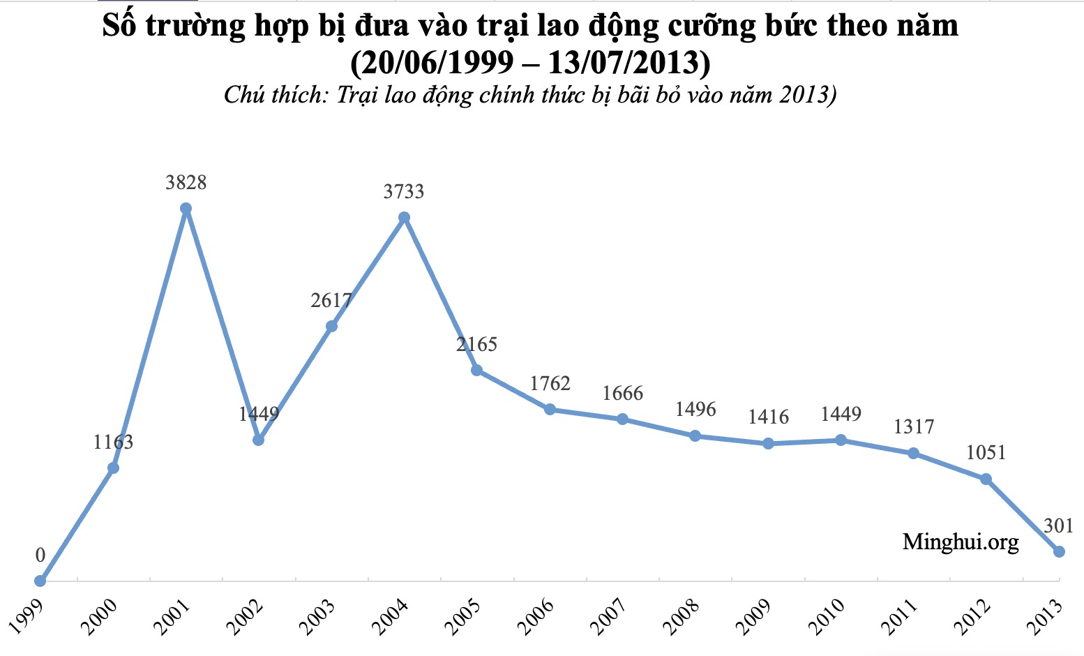 Ghi chú: Trại lao động cưỡng bức do ĐCSTQ du nhập vào Trung Quốc từ Liên Xô và được các cán bộ ĐCSTQ các nơi sử dụng rộng rãi nhất để bức hại Pháp Luân Công. Loại hình này đã chính thức bị giải thể vào năm 2013, do đó biểu đồ này kết thúc ở năm 2013)